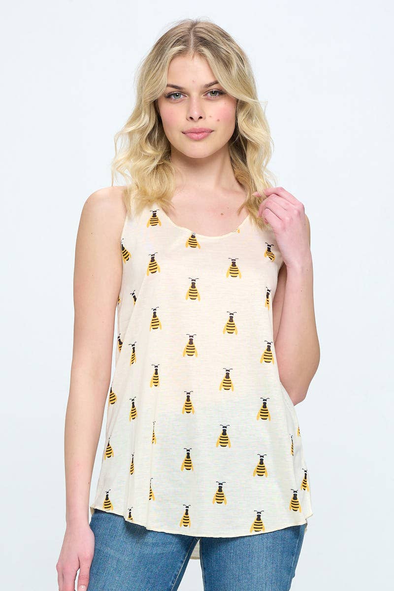 Step into summer with our bee print tank top! This lightweight recycled polyester tank features adorable bees all over the front and a loose fit to help you stay cool.