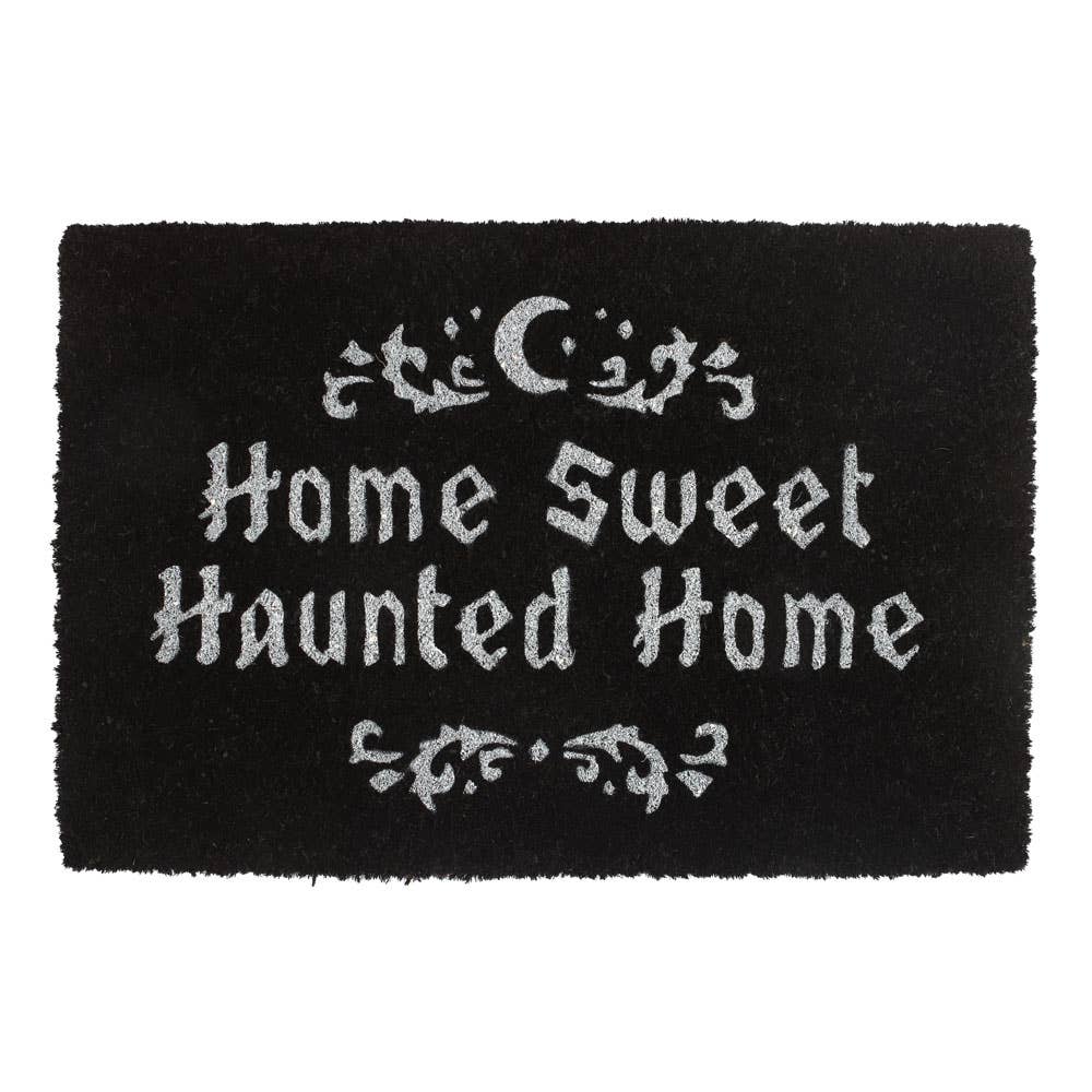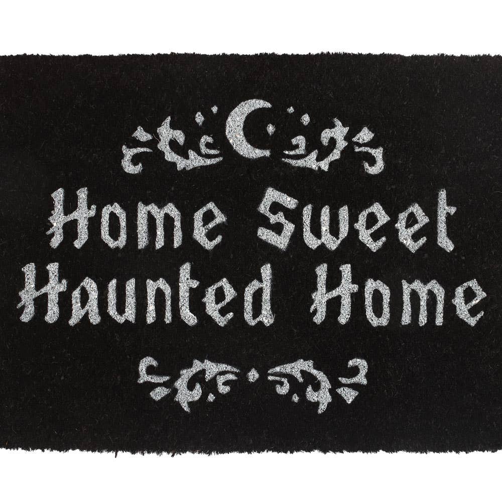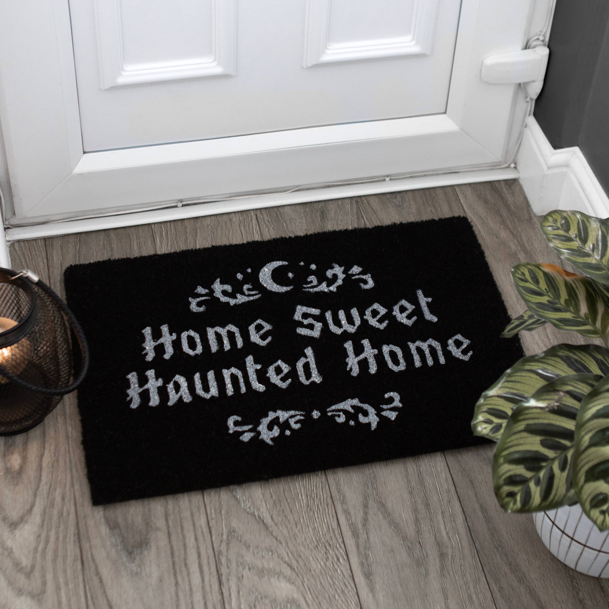 Welcome to your haunted haven! Perfect for adding a touch of creepy curbside charm, this bold black doormat reads 'Home Sweet Haunted Home,' setting the tone for your gothic mansion. Made from durable coir, this statement doormat is tough enough to withstand the busiest of haunted houses, making it an ideal decor piece for those who embrace the dark and eerie. Step into your spook-tacular sanctuary with this must-have accessory for any haunted home! Due to the high concentration of dye used to obtain this color do not place onto pale surfaces, as this may result in dye transfer. Design may fade in extreme weather. Suggested for sheltered and indoor use only.