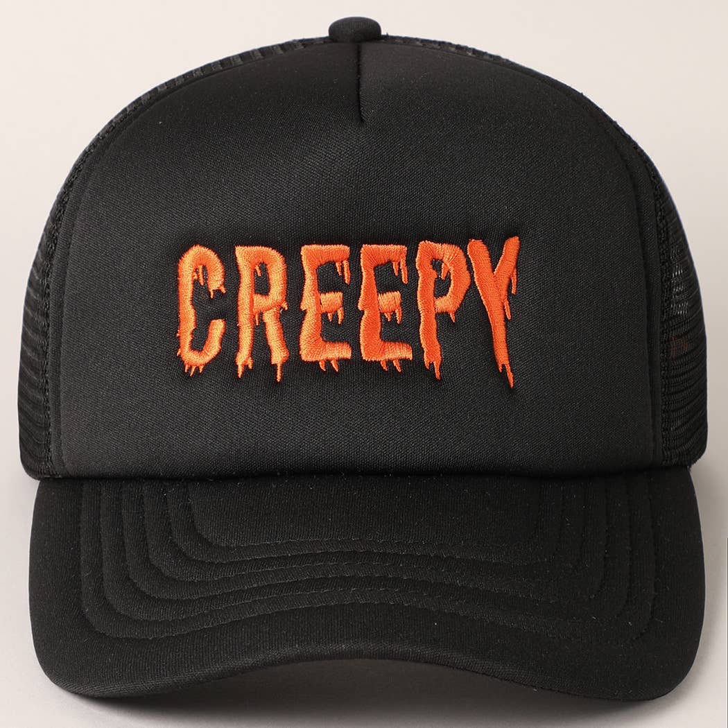 Let people know exactly how you're feeling with our "CREEPY" embroidered mesh back trucker hat! Perfect for Halloween, this 100% cotton cap offers a comfortable fit with an adjustable snapback. The intricate embroidery adds a unique touch to your Halloween style. One size fits all.