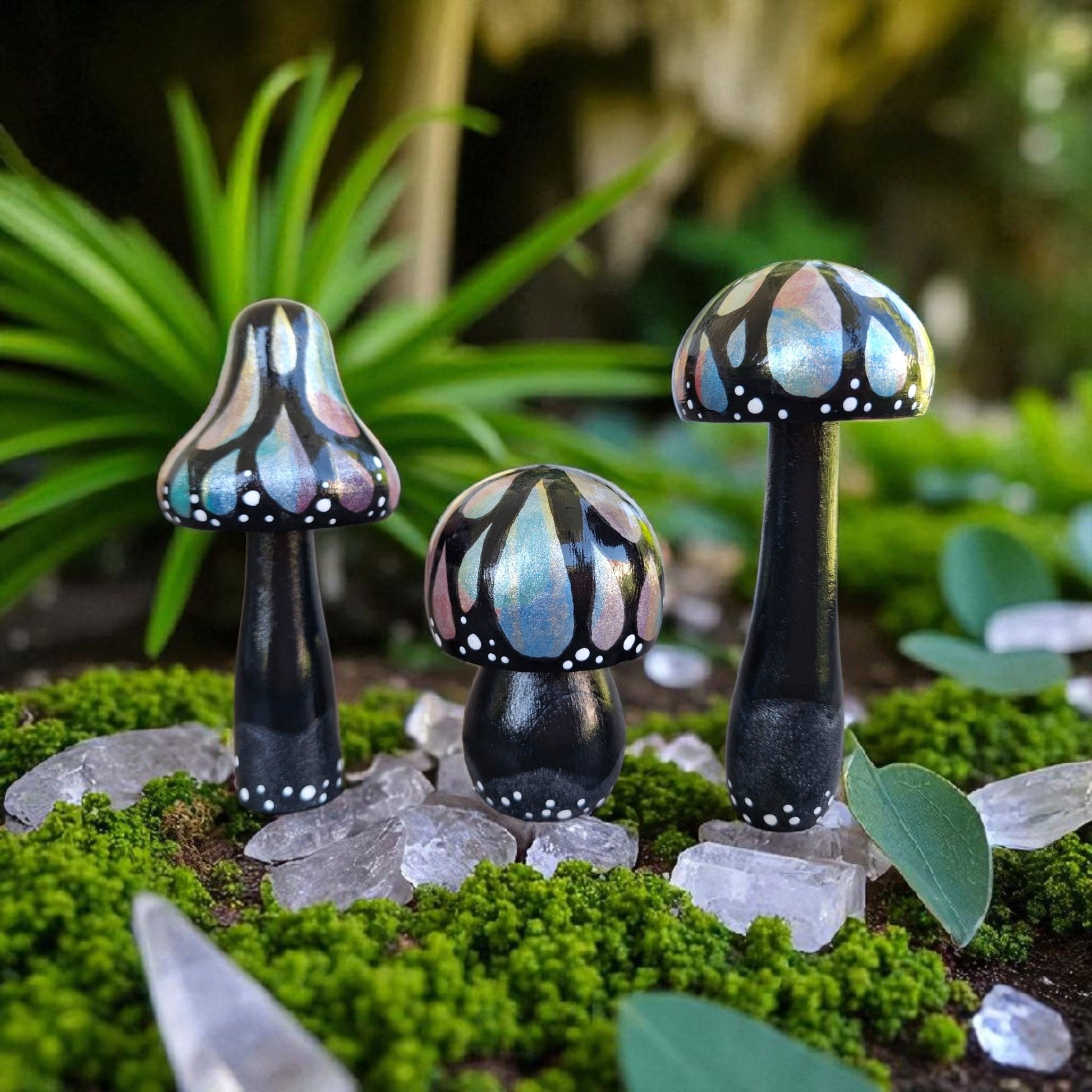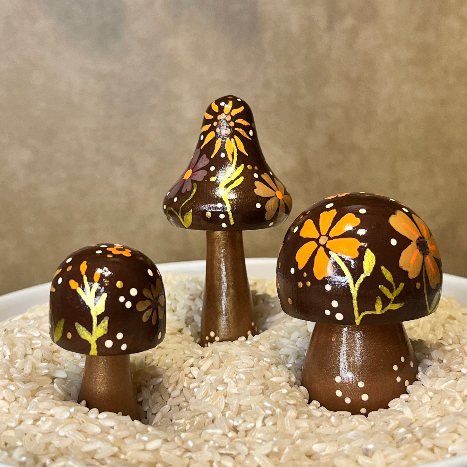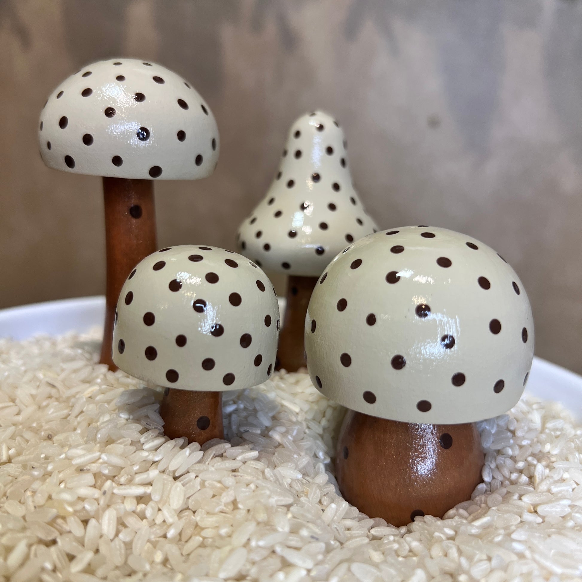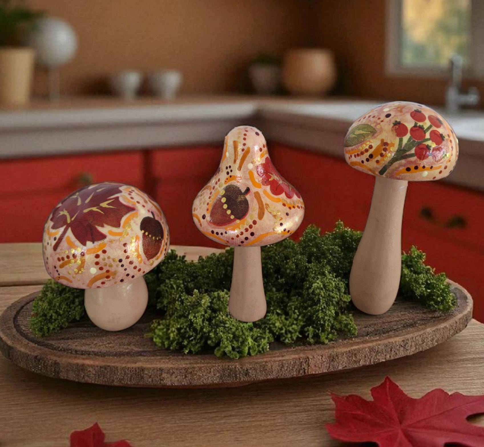 Bring a touch of woodland whimsy to your home or garden with these hand-painted wooden mushroom sets by local artisan Jen Bauer. Each set includes 3 or 4 freestanding mushrooms, ranging from 2 to 4 inches tall, painted in a mix of neutral tones and vibrant colors. Every set is one-of-a-kind—no two are alike!