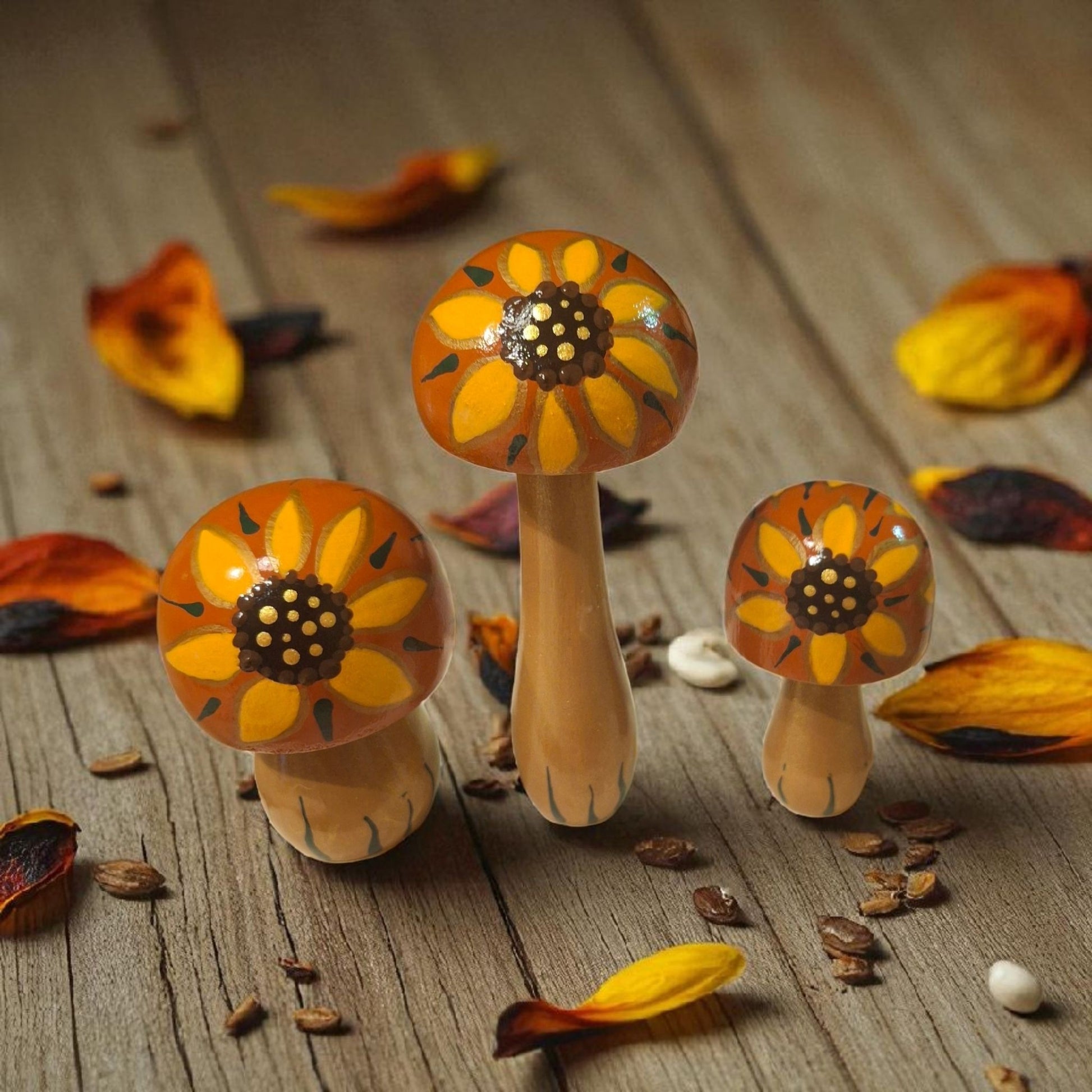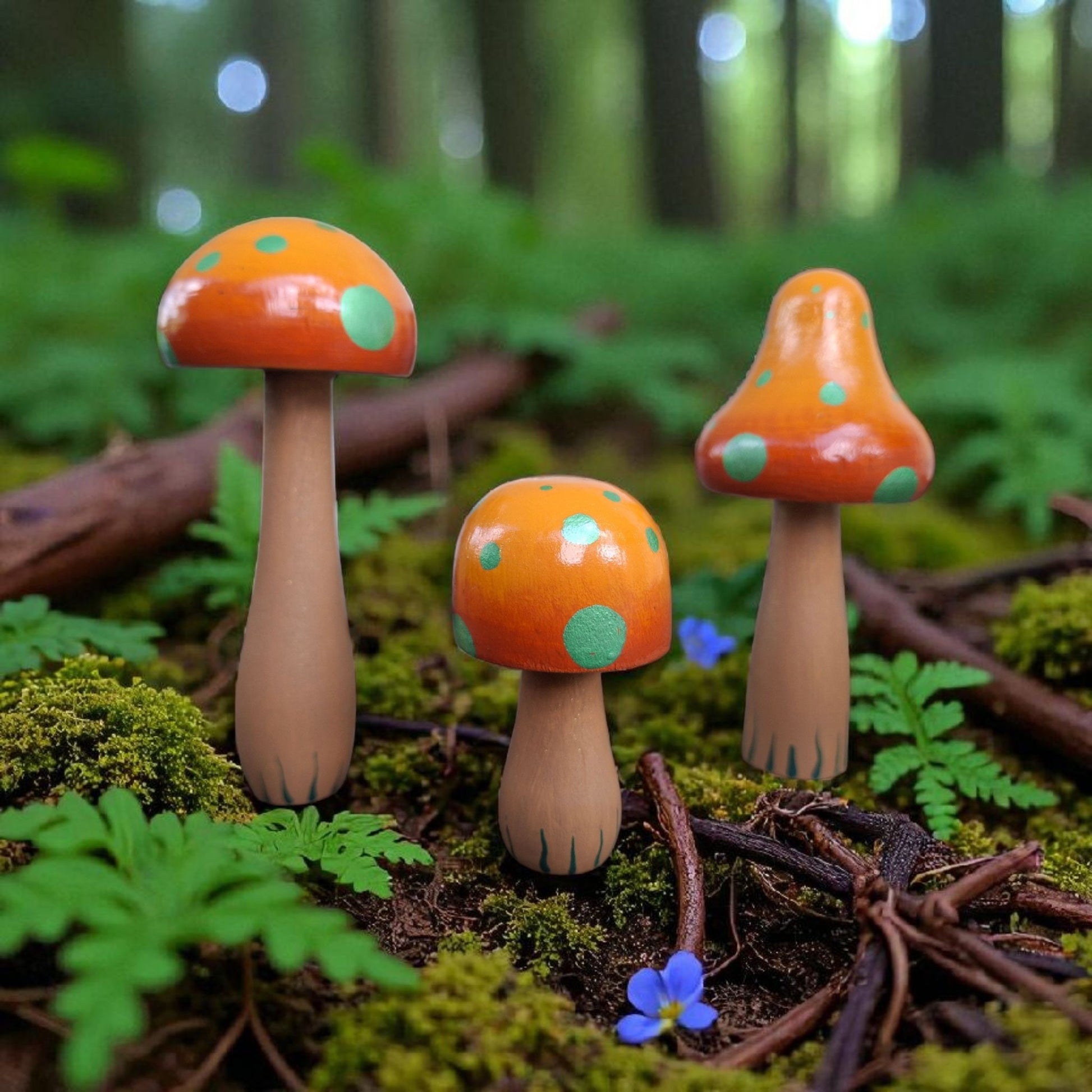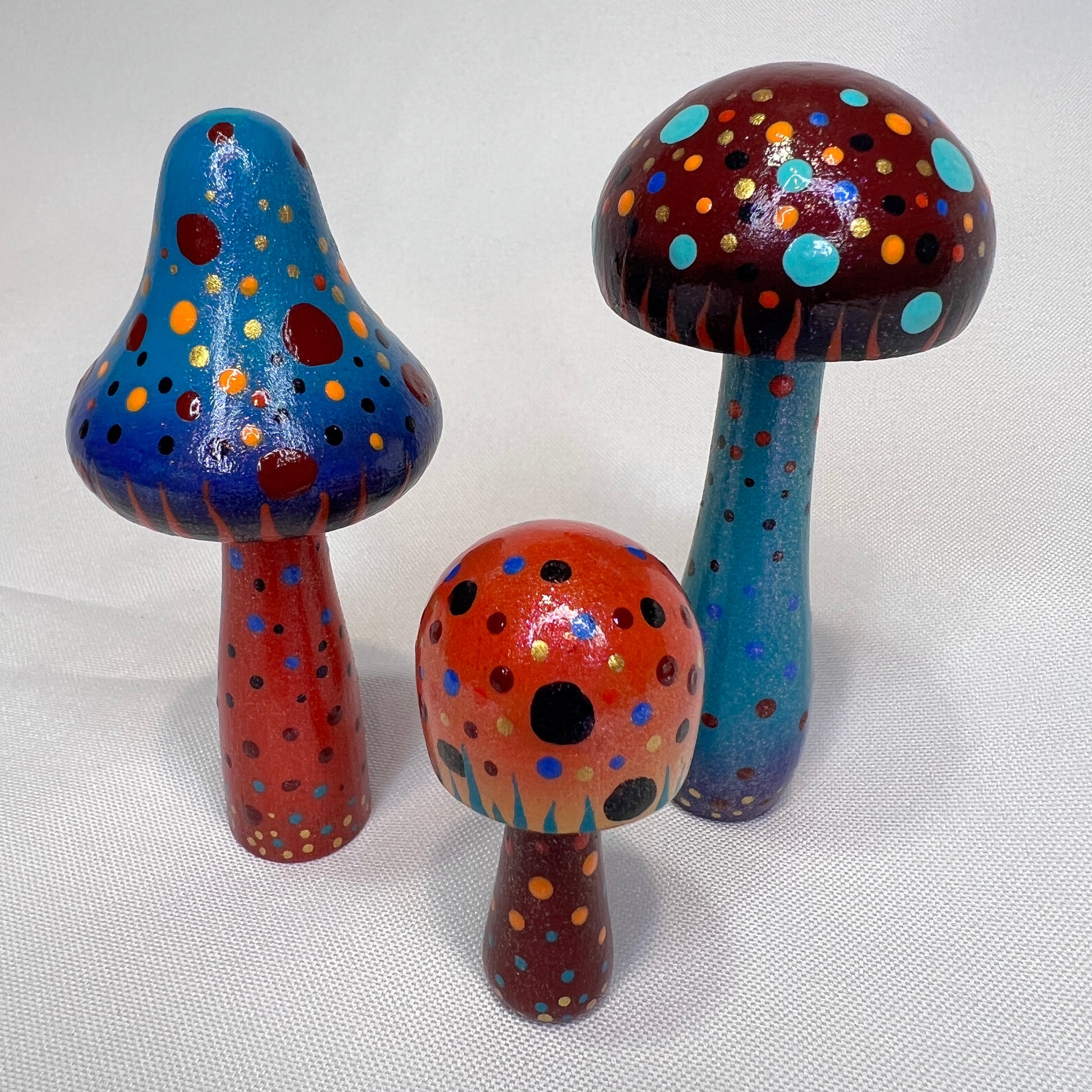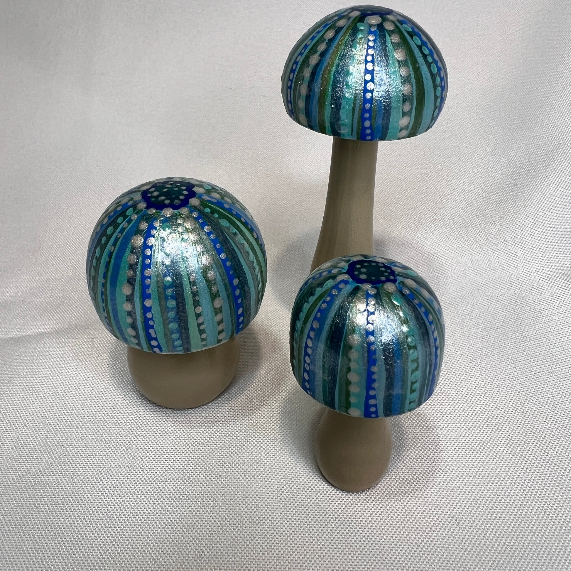 Bring a touch of woodland whimsy to your home or garden with these hand-painted wooden mushroom sets by local artisan Jen Bauer. Each set includes 3 or 4 freestanding mushrooms, ranging from 2 to 4 inches tall, painted in a mix of neutral tones and vibrant colors. Every set is one-of-a-kind—no two are alike!