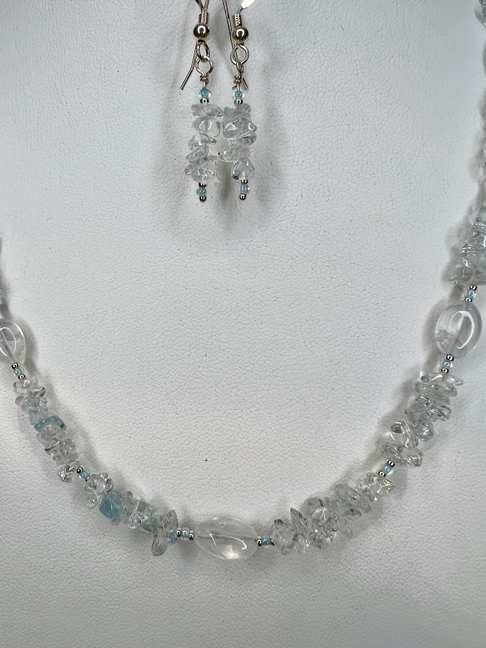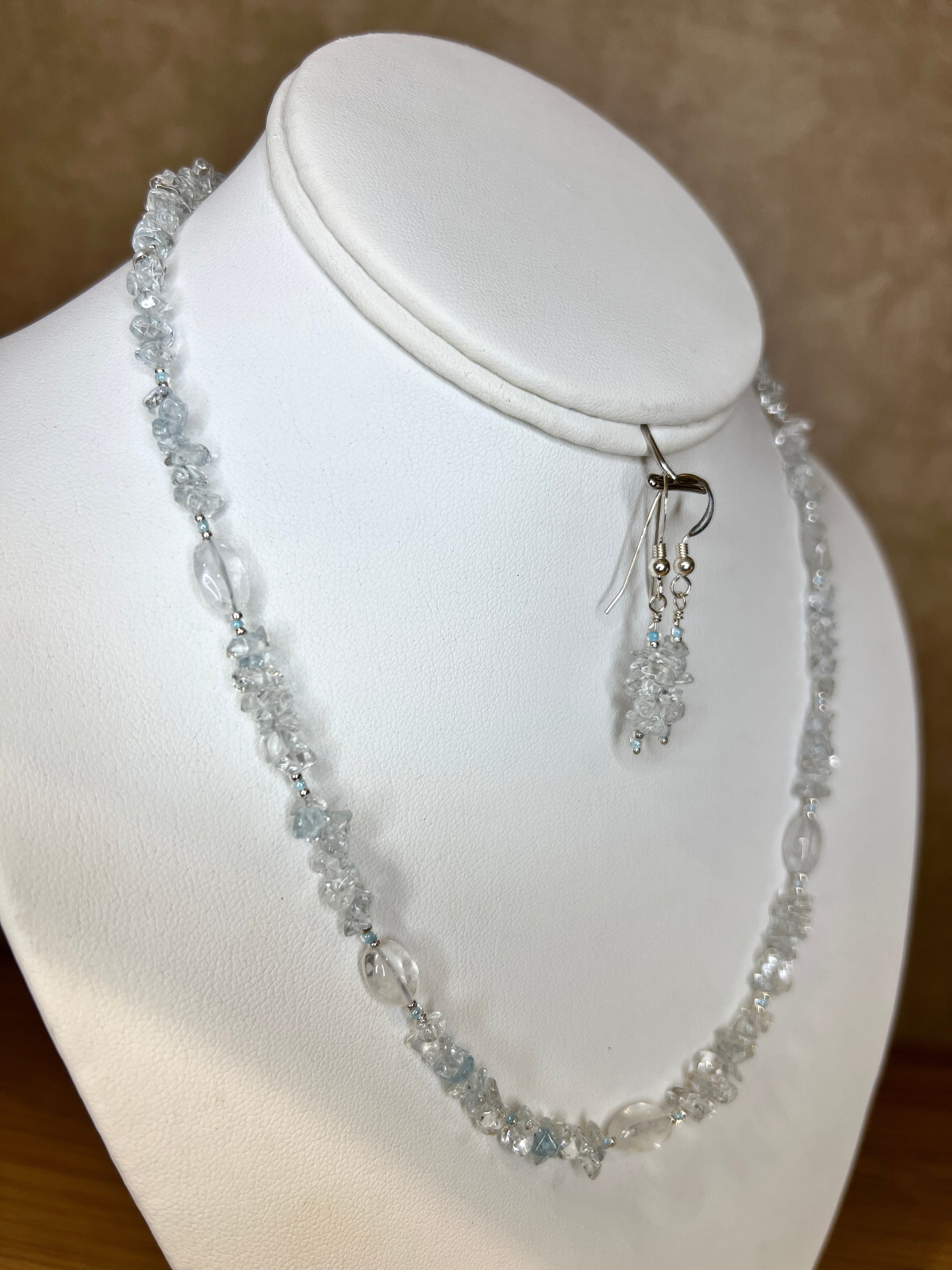 This set is truly made for a queen! With stunning blue topaz chips and beads, every little movements captures the light like the sun shining through a crystalline palace. These crystal-clear topaz gemstones have just a hint of blue in them, making them perfect for all year but especially winter! Blue Topaz is December's birthstone.