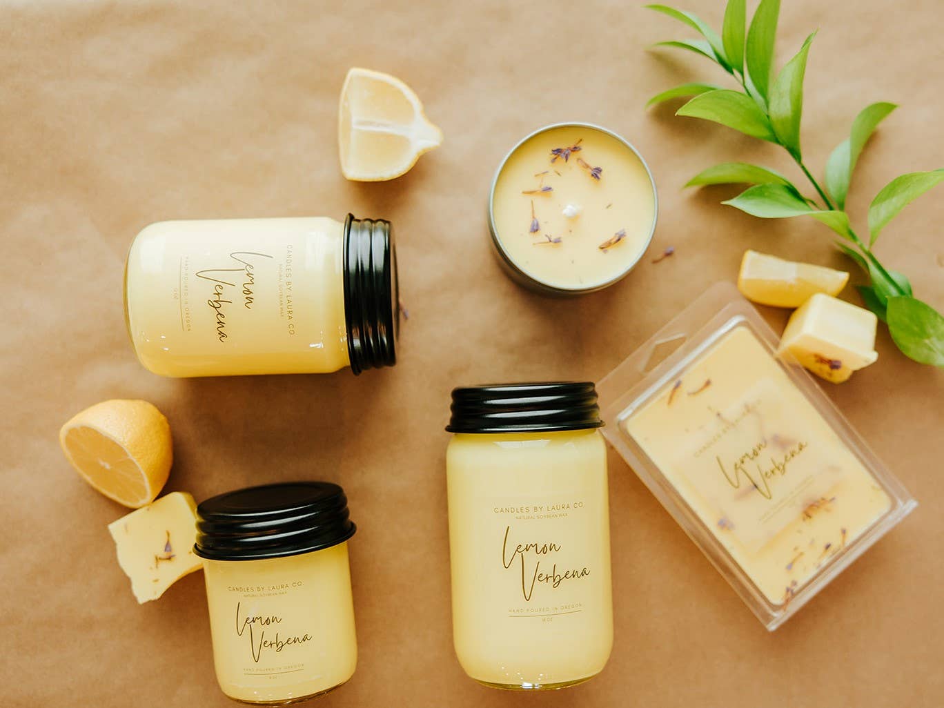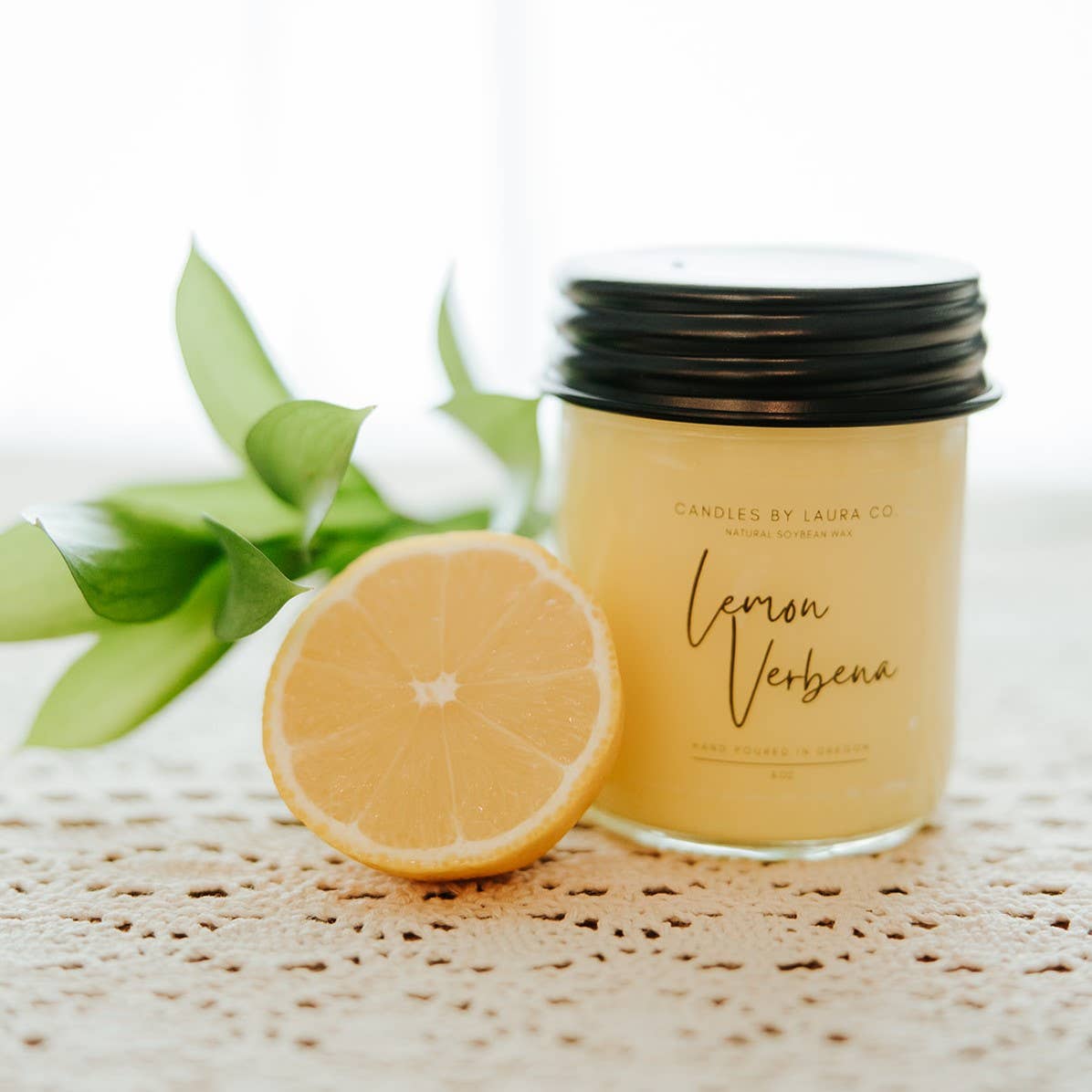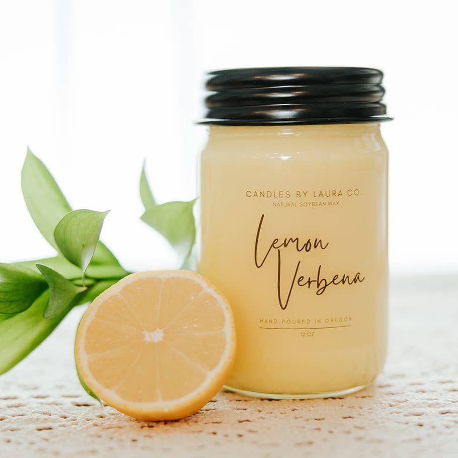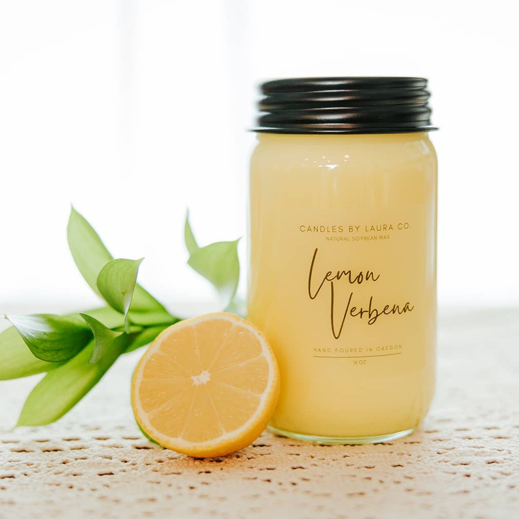 Spunky lemon and floral verbena combine in this uplifting citrus delight. The scent begins with bright lemon that gives way to a heart of lemon verbena and lemongrass. A vanilla base note grounds this beautiful herbal citrus fragrance. Bring this strong lemon scent home with you in canning jars with primitive black screw-on lid.