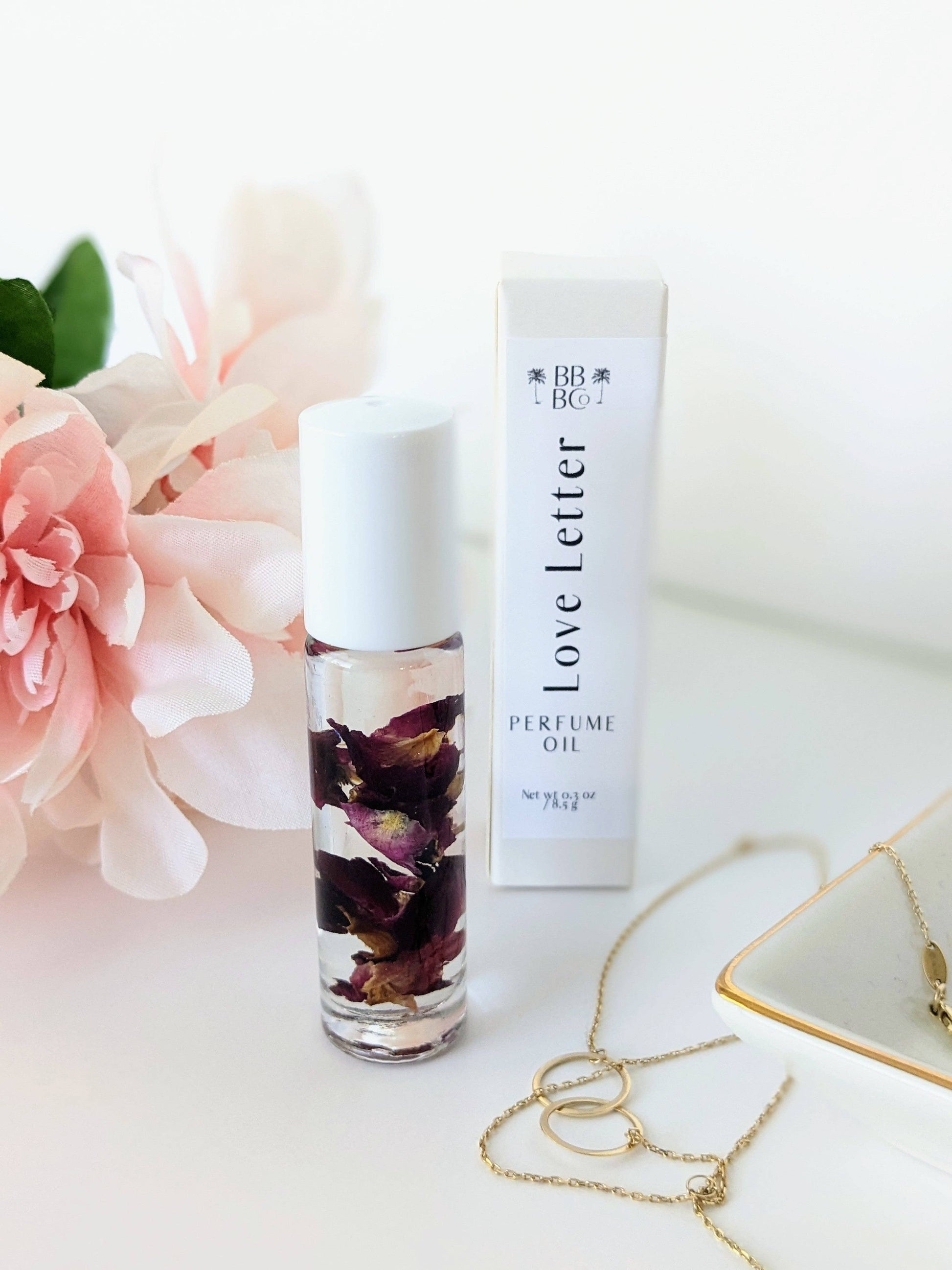 Love Letter perfume oil's floral scent has hints of citrus, amber, and musk. It's a perfect choice for those seeking a romantic, feminine scent that won't overpower the senses. Infused with red rose petals for a glamorous look. Our perfume oils come in a glass rollerball, perfect for taking on the go. Net Wt 0.3 oz / 8.5 g