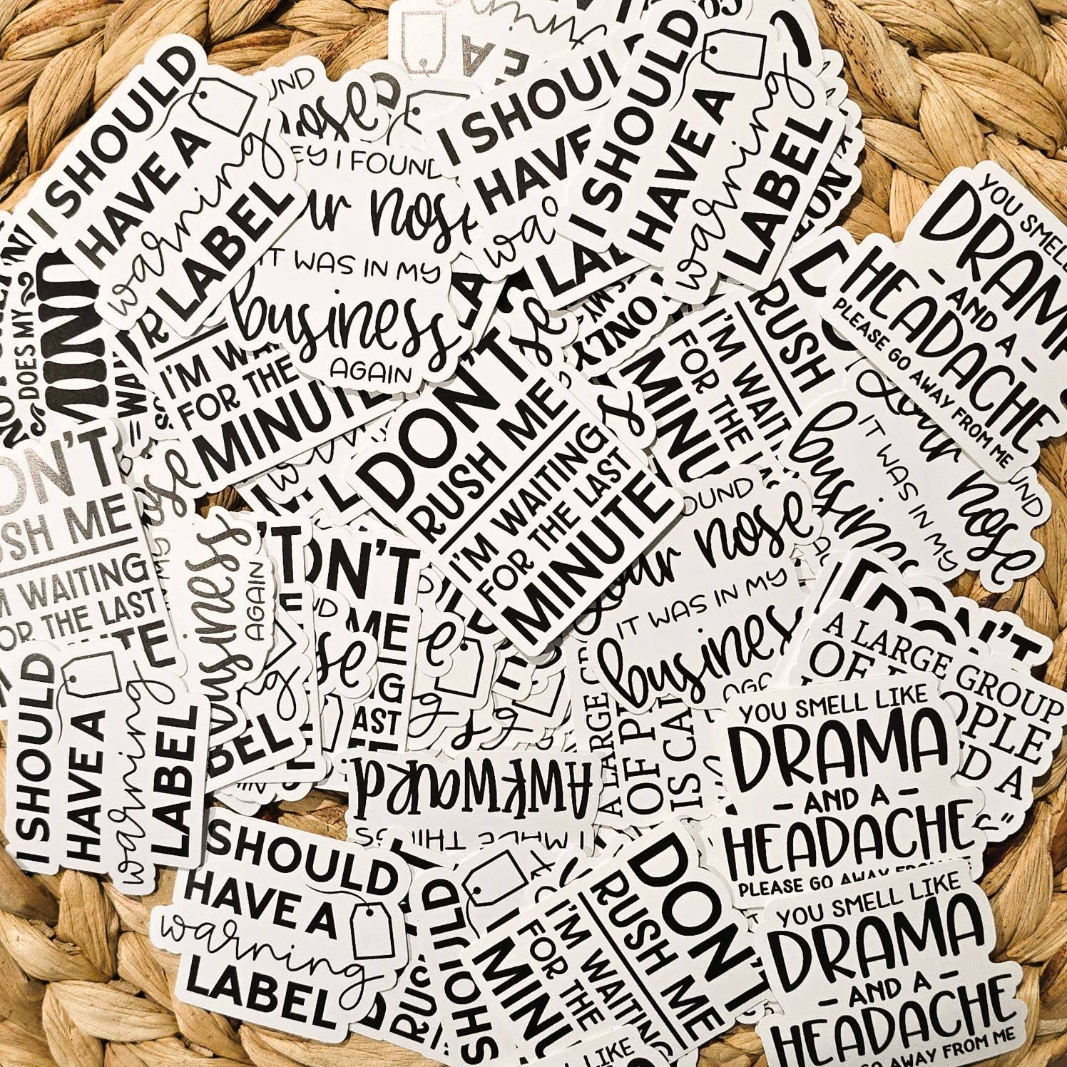 Have fun with a mystery sticker! These black and white quote stickers are randomly assorted - Approx 2” - Case Size: 10 Stickers - Matte Finish - 3-5 Year Outdoor Life - 100% Waterproof & Scratch Resistant