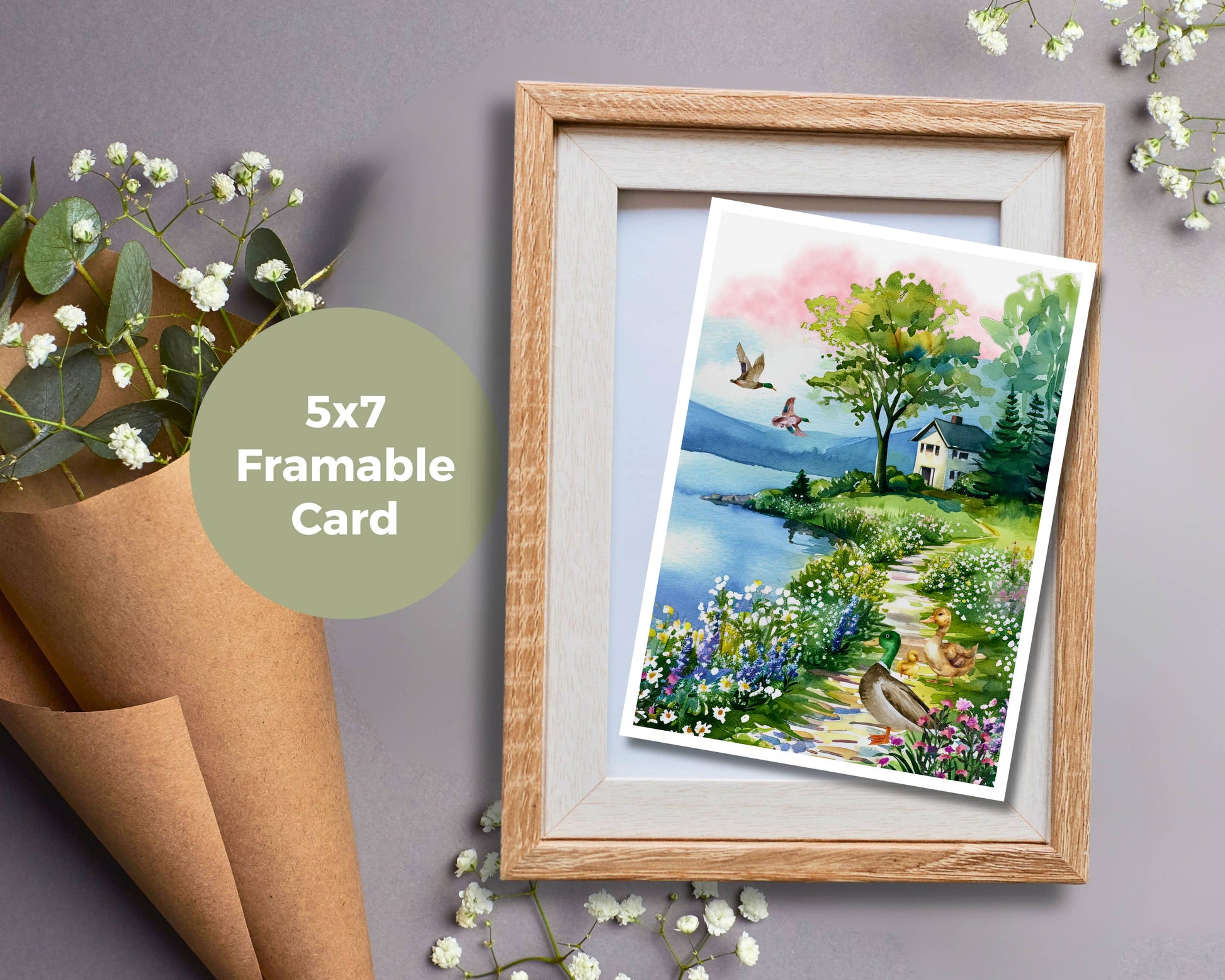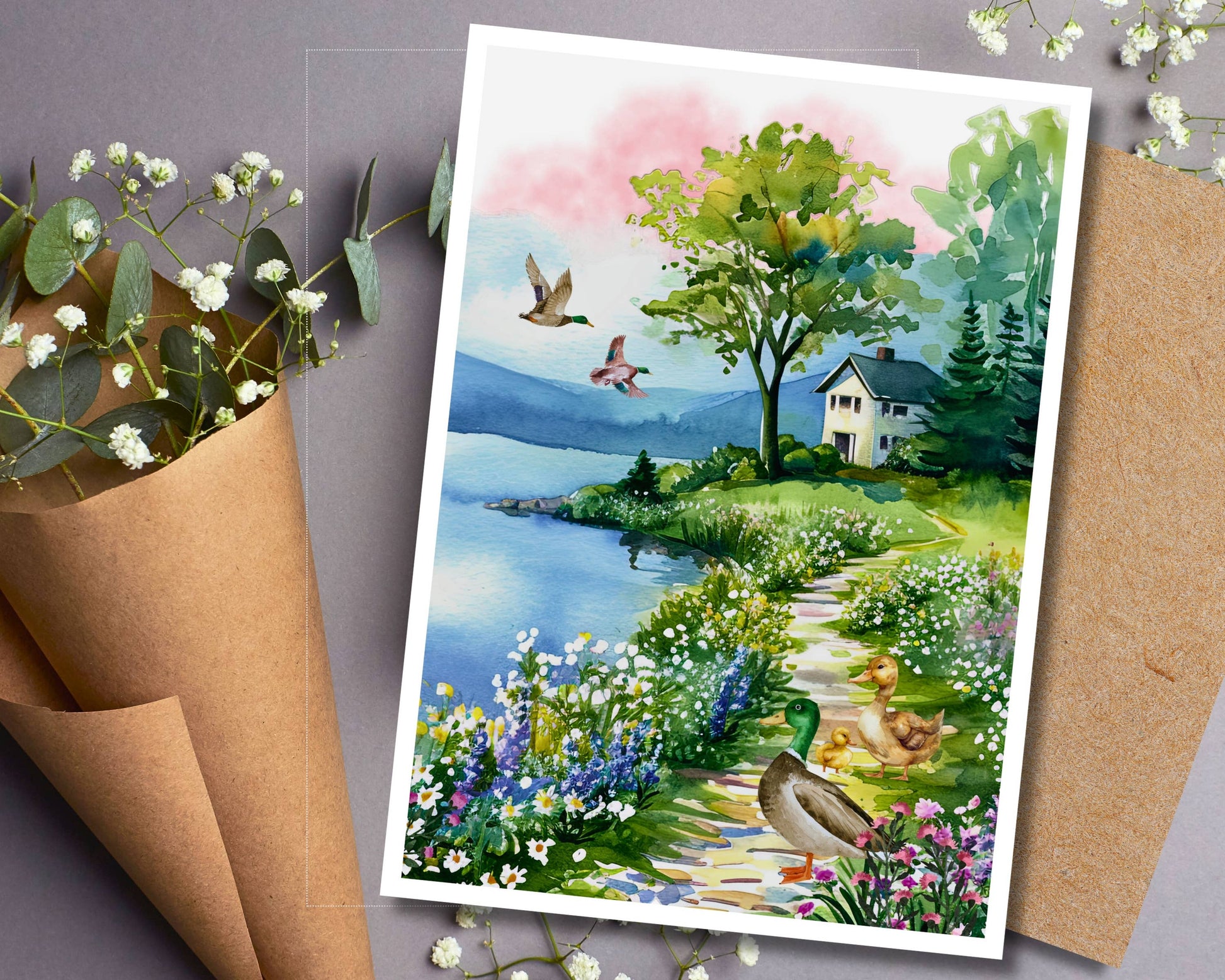 Delight your loved ones with this charming watercolor greeting card featuring a serene scene of ducks enjoying a peaceful day on a lakeside path, surrounded by vibrant flowers and lush foliage, with more ducks gracefully flying overhead. Expertly printed on high-quality cardstock, this card radiates both elegance and warmth. Paired with a rustic kraft envelope, it’s the perfect way to send your heartfelt messages on any occasion. The intricate details and soothing colors make it a keepsake that will be cherished long after the day has passed. In fact, this beautiful card is more than just a greeting; it’s a piece of framable art. Whether displayed in a frame or placed on a mantel, it will continue to bring joy and tranquility to any space.