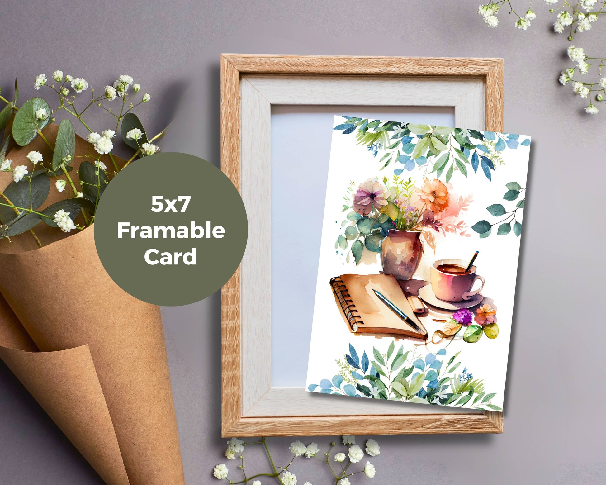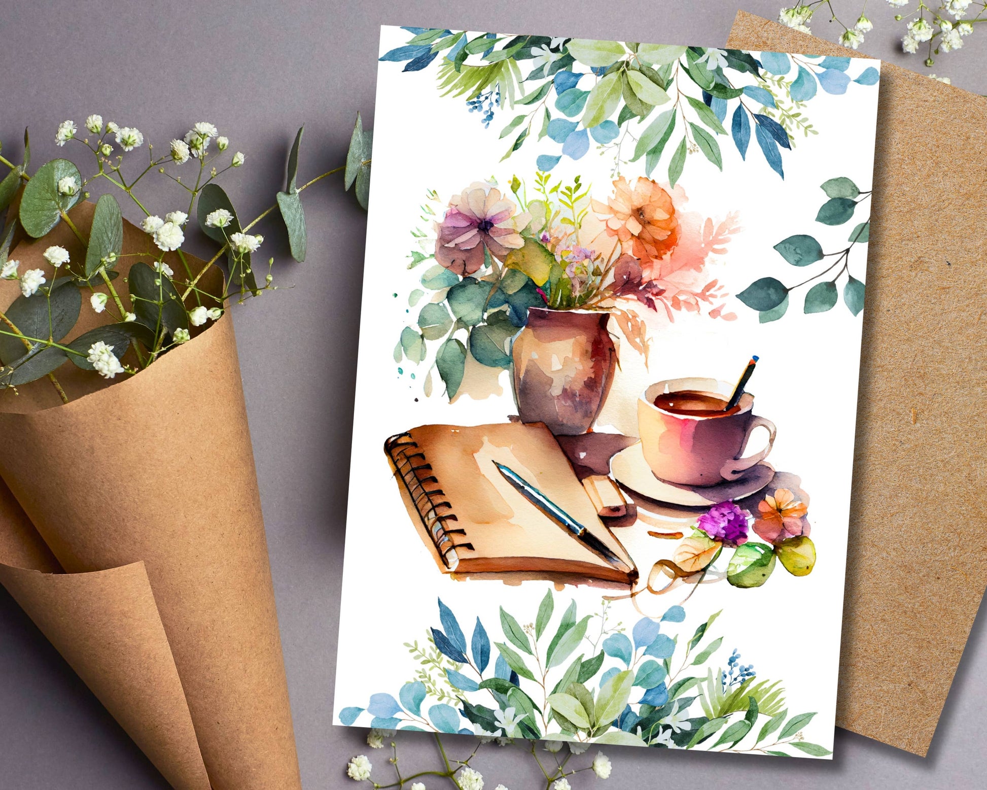 Introducing our charming watercolor greeting card featuring a beautifully illustrated floral journal nestled under an umbrella of lush green foliage. This exquisite design captures the delicate beauty of nature, making it perfect for any occasion. Printed on premium quality cardstock, the card ensures a luxurious feel and lasting impression.