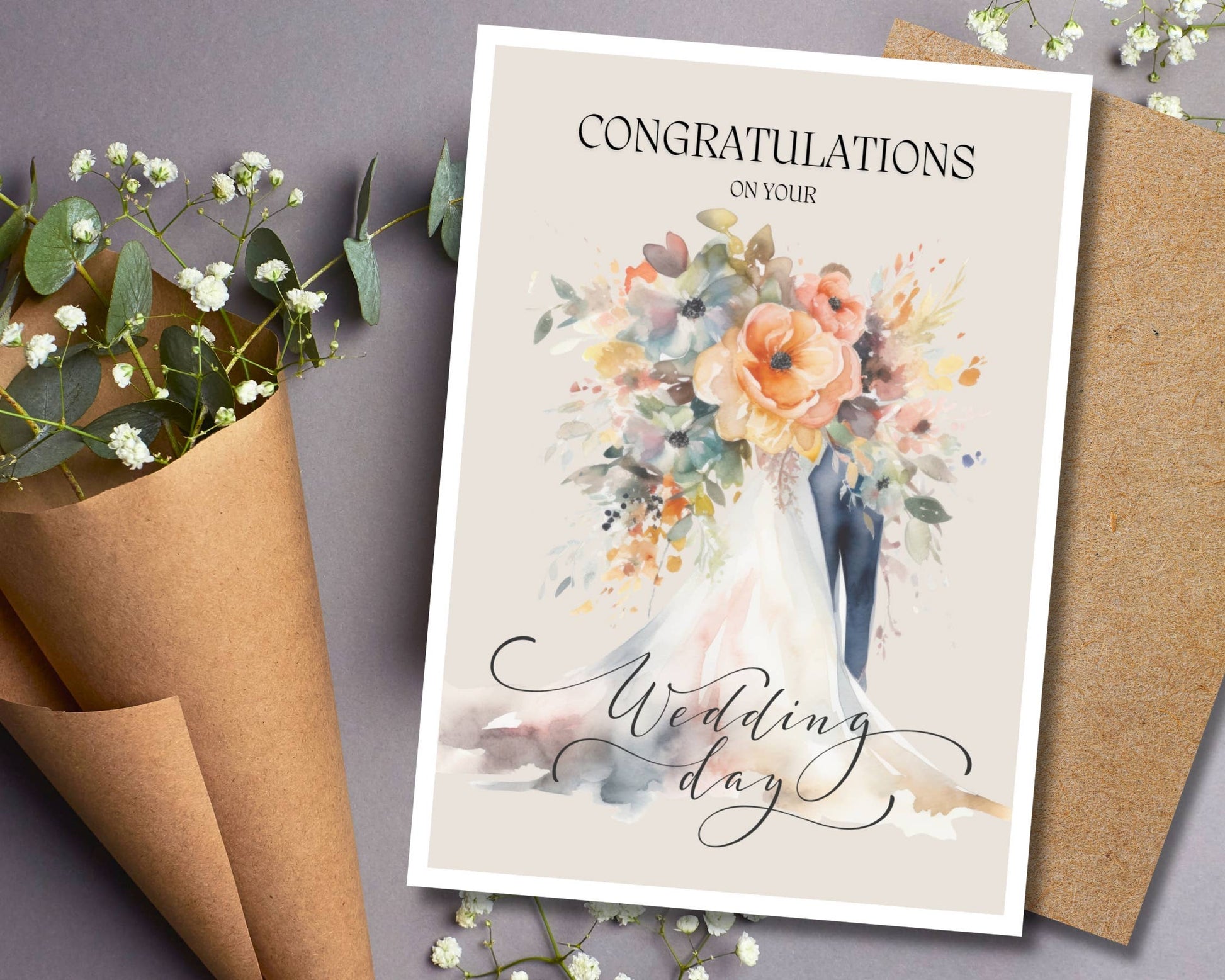 Celebrate the joyous union of a special couple with this elegant greeting card, featuring a charming illustration of a bride and groom standing in front of a stunning watercolor floral bouquet. The graceful flowers add a touch of whimsical beauty, perfectly complementing the heartfelt message of "Congratulations on your Wedding Day."